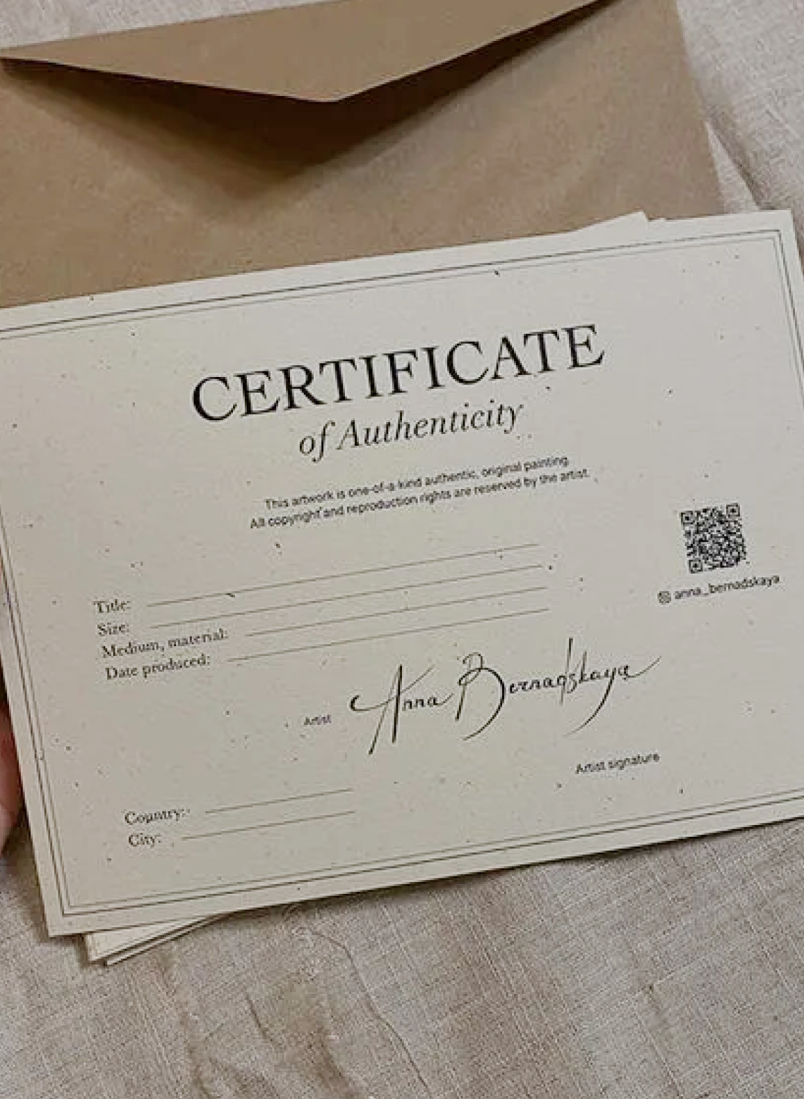 A certificate of authenticity is included A gift-style package is provided Paper artworks are sent in thick protective envelopes Canvas paintings are packed in custom sturdy boxes with bubble wrap